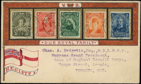 1899 Krippner Patriotic hand illustrated cover of framed ‘V.R.’ and flag ‘SOE’ type, franked by ‘Royal Family’ issue and 1897 1ct 'Queen Victoria' , tied by St Johns NEWFL'D cds for SP 30 99, fine, very attractive.