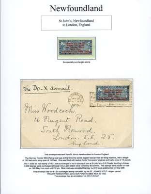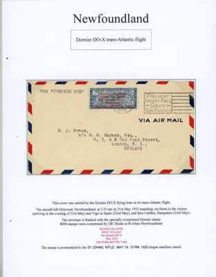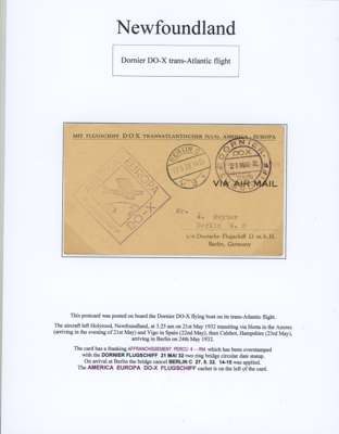 1932 ‘Dornier DO-X’ flight collection including surcharged $1.50 on $1 deep blue, fine o.g. cover flown from St Johns to England, franked by Air $1.50 on $1 deep blue, tied by machine cancel dated 20 MAY endorsed ‘via DO-X air mail’, second cover flown from St Johns addressed to England cancelled by machince cancel for 19 MY and postcard addressed to Berlin bearing America/ Europa decorative h/s in violet with Dornier Flugschiff 21 MAI 32 cachet, and Berlin arrival, lot also included picture postcard of the air craft and baggage label, generally fine condition.