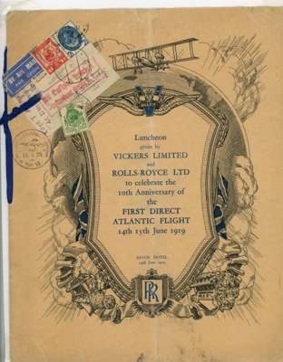 EPHEMERA: 1929 Menu for Luncheon held at the Savoy Hotel given by Vickers Limited & Rolls Royce Ltd, to celebrate the 10th Anniversary of the First Direct Atlantic Flight, franked with 1929 PUC ½d,1d & 2½d tied by London cds addressed to Sweden, with Berlin transit mark and Stockholm arrival for 17.6.29, a fascinating item, an ideal frontispiece.
