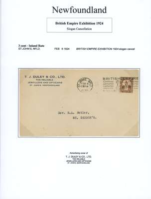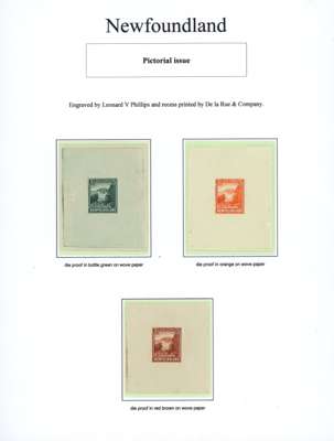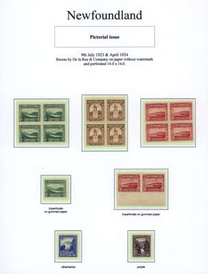 1923-24 Publicity issue, mint and used collection on exhibition pages, including: basic set, imperf colour trials of 5ct in carmine, ochre and brown, die proofs on unmwkd wove in bottle green, orange and red-brown, 1ct imperf single, 2ct imperf pair, examples on cover and 3ct on cover tied by British Empire Exhibition, St Johns slogan postmark, generally fine condition. SG 149-162