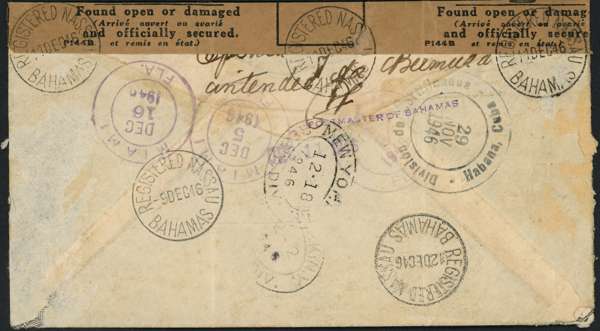 POSTAL HISTORY: 1946 registered cover from Cuba addressed to Bermuda, resealed in the Bahamas with official brown paper tape