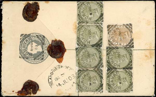 POSTAL HISTORY: 1886 2a ultramarine registered envelope (size F) addressed to Bombay uprated with 1876 6a pale brown and 1882-90 4a olive-green (6, three pars), all tied by ‘HONAVAR/11 JUN./03’ squared circles, ‘Inland Reg’d Office/14 JU 03/Bombay' arrival cds, the obverse with ‘HONAVAR’ boxed registered hs. Fair, SG 78, 95