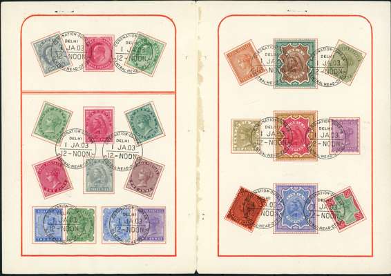 1903 Coronation Durbar Presentation Pages from the Souvenir Postal Guide with 1895 QV ½a to 5r (19 values) and KEVII 1902 3p ½a and 1a, all tied by special printed Coronation Durbar 1903 cds, odd minor blemishes, still fine, increasingly hard to find intact. SG 107-123