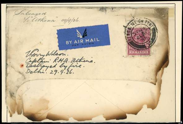 CRASH COVER: 1936 (29th September) KGV 6d purple on severely-charred cover cancelled Newcastle-Upon-Tyne, endorsed "Salvaged Athena 29/9/36" which while carrying mail from UK to India, Malaya and Australia caught fire at Delhi aerodrome while preparing for take off. Additionally endorsed by Captain Wilson “R.M.A. Athena. Destroyed by fire. Delhi. 29.9.36.”