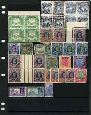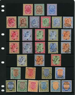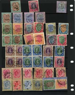 1895-1948 mint and used collection arranged on Hagners with strength in high values, including: 1895 set to 5r with some opt ‘Postal Service’, 1902-10 KEVII values to 25r telegraphically used, with Officials, 1911-23 KGV single stat wmk range to 25r, 1926-33 to 25r, with 15r (wmk inverted) mint block of four, 1937-40 KGVI set to 25r (the latter with small crease), I.C.S Gwalior 1938-48 25r, I.C.S Jind 1941-43 25r, Burma 1937 on India KGV opts 1r,2r & 5r, sampling of Used Abroads mostly with Aden cds, generally fine condition.