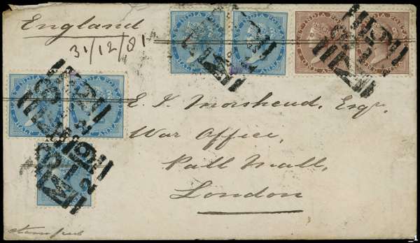POSTAL HISTORY: 1882 (Jan) from Devalah to the War Office, London franked with 1865 1a, horizontal pair, and 1873 ½a blue (5), cancelled by strikes of the square (Type 17b) Devalah ‘3/M-19/2’ obliterator and manuscript lines, the reverse with Devalah (1.1) despatch, Bombay (5.1) transit and London (Jan 2?, 82) arrival cds; small part of backflap missing otherfine fine. A rare envelope. BPA Certificate (2019). SG 59, 76