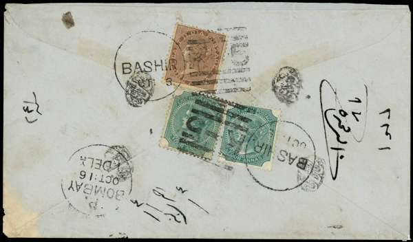 BUSHIRE: 1880 envelope addressed to Bombay franked on the reverse with India 1856-64 1a brown and 1866-78 4a blue-green (2, die I and II) tied with ‘BASHIR/OCT. 3./K-5’ duplex, Bombay arrival (16.10), the obverse with Bushire boxed registration marking. A fine and scarce registered cover