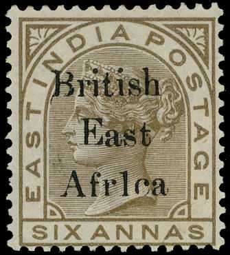 1895-96 stamps of India overprinted on 6a pale brown variety 'Af1ca' for 'Africa' (Row 1/7); part og. Good appearance. SG 56b, £2,500