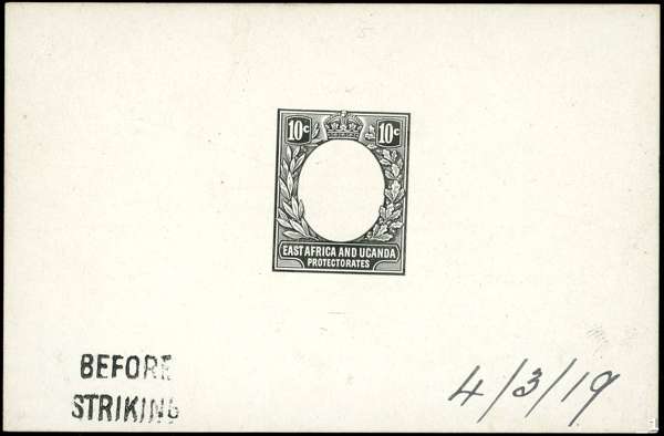 1919 (4 march) 10c die proof of the frame in black on glazed card (92x60mm), stamped ‘BEFORE/STRIKING’ and annotated ‘4/3/19’ in manuscript. A rare late proof for the 1912-21 issue probably struck in connection with repairs to the plate. Fine