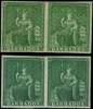 1855-58 white paper (½d) yellow- green, horizontal pair, good to large margins, small mark on reverse of r/h stamp, part o.g. also blued paper (½d) deep green, horizontal pair, good to large margins, unused no gum. SG 2, 7