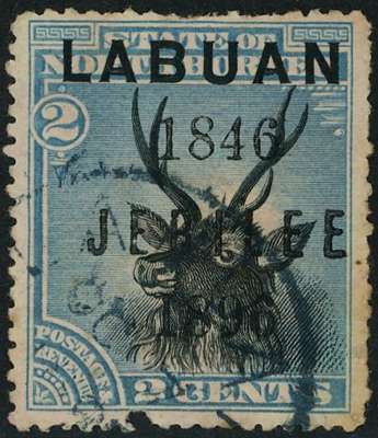 1896 Jubilee 2c black and blue with R8/7 JEBILEE overprint error, used, faults. Brandon Certificate (2003), ‘Defect at base and other faults’. SG 84b, £1200