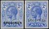1921-22 Script CA 2d colour trails in blue overprinted ‘SPECIEMEN’ (Samuel types DS1 and DS3), on ungummed watermarked paper. Fine.