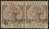 BARBADOS: 1892 ½d on 4d deep brown, horizontal pair, variety surcharge double, the second impression albino