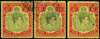 1938-53 5s dull yellow-green and red on yellow, line perf 14¼ (3rd printing), three used examples with varieties comprising ‘LOWER RIGHT SCROLL WITH BROKEN TAIL’, ‘BROKEN LOWER RIGHT SCROLL’ and ‘GASH IN CHIN’; all with part cds leaving varieties clear; the latter with one slightly shortish perf otherwise fine. Ex-Springbett. SG 118bc, be, bf