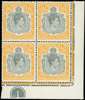 1946 (Jun.) 12/6d grey and yellow on ordinary paper, the ‘lemon’, in an unmounted o.g. Plate block of four. Difficult in a multiple, desirable and very scarce in a Plate block. BPA Certificate (1966) when SG 120b. SG 120d, £2400+