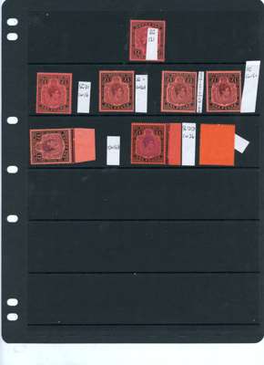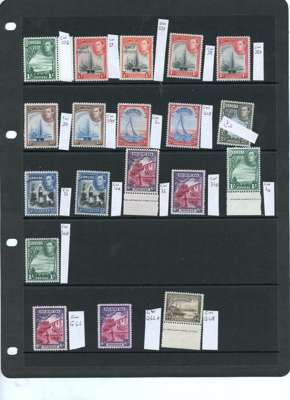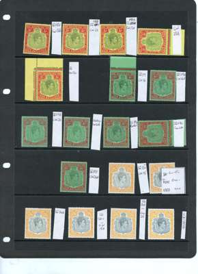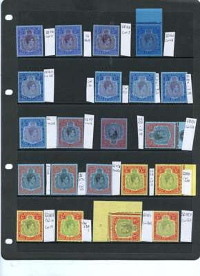 1938-52 collection (88) all carefully identified by CW numbers on Hagner sheets, o.g., three stamps hinged with the rest seemingly unmounted. Nice low value range, the high values with a good degree of completion including line perfs (2/6d lightly hinged); 5/-s complete, the November 1941 printing (SG 118c) a lower left corner example with HPF #49 scratched scroll, a rare positional example; 10/-s complete per SG; 12/6ds (5), no lemon (block extracted for separate offering); £1s complete with an extra SG 121 (this hinged). A fine collection, either for break-up or expansion. SG 110-121e