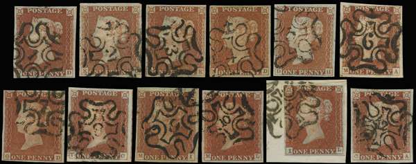 1841 1d Red-brown. Very fine used four margin set of twelve cancelled by good to extremely fine strikes of London No.‘s 1-12 in MC. An attractive and difficult set to assemble so fine.