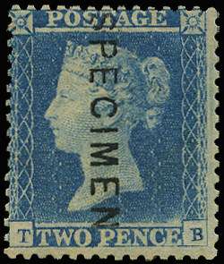 1855 2d Blue Pl.4 (Wmk. Small Crown, Perf. 14). Very fine unused o.g. example lettered TB, overprinted "SPECIMEN" type 2. Very scarce.