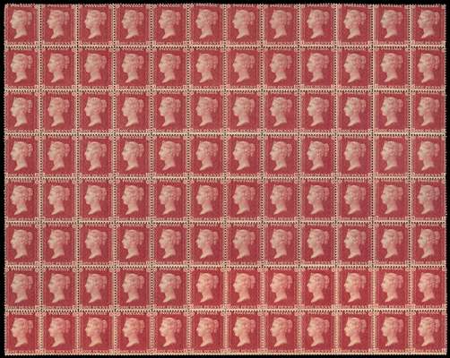 1857 1d rose-red block of 117 (13x9), IA to QL, plus r/h 6 stamps of the lower strip (RF-RL), a superb and scarce multiple, slight damage to the lower strip of 6 otherwise fine unmounted o.g.