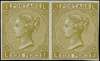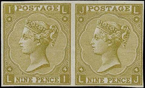 1865 9d Straw Plate Proof Pl.4. Very fine unused imperforate horizontal pair lettered LI-LJ, printed on ungummed, unwatermarked thin wove paper. Small paper fault on LI nevertheless a magnificent and very rare proof, lovely vibrant colour.