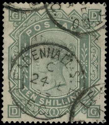 1867-83 Anchor 10/- greenish grey used with several part ‘Leadenhall St’ cds, very slightly faded but an attractive example of this scarce high value. SG 135, £4000.