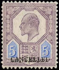 1906 5d Dull purple & ultramarine (C). Very fine unused o.g. example printed by DLR, overprinted "CANCELLED" type 19. A magnificent example of this extremely rare overprint. Spec M29(1)t. Ex. NPM Archive sale.
