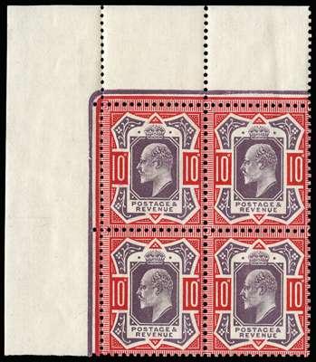 1910 10d Dull purple and scarlet (C). Very fine unmounted o.g. top left hand corner marginal block of four printed by DLR. Top right hand stamp showing variety "No cross on Crown". Attractive multiple with this scarce variety. Spec. M43(5)d.
