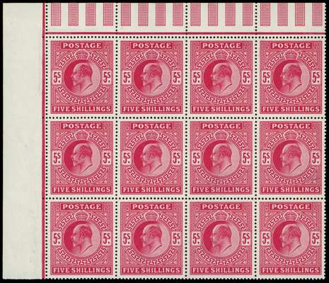 1902 5s Bright carmine. Superb unmounted o.g. top left hand corner marginal block of twelve printed by De La Rue. An exceptional multiple and undoubtedly one of the largest surviving pieces of this issue Spec. M51(1).