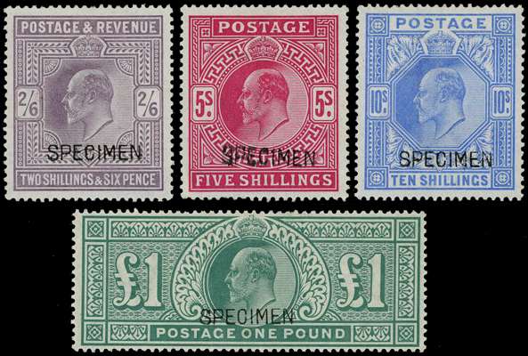 1902-10 De La Rue High values, 2/6d-£1 optd ‘SPECIMEN’ type 16, large part o.g few odd blunt perfs to 5/- nevertheless a fine and difficult set to assemble. SG 260-266var