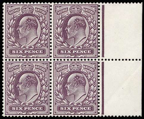 1913 6d Deep plum (C). Very fine unused o.g. block of four printed at Somerset House showing variety "No cross on crown" on top left hand stamp from Pl.9. position R. 11/11. Scarce. Spec. M36d.
