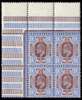 1911 9d Deep dull reddish purple & deep bright blue. Very fine unused o.g. top left hand corner marginal block of four printed at Somerset House with the right hand vertical pair showing varieties "Damaged S.E. corner" and "Damaged upper right corner" from Pl.H2, Pane D Position R.1/2 & R.2/2 respectively. Spec M41(2)d&e.