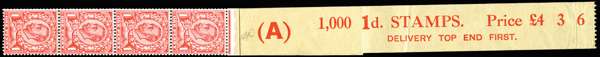 1912 1d Bright scarlet (Die 2, Wmk. Crown). Superb scarlet on buff coil leader (Code A) with four stamps attached, stamps 1 and 3 showing "No cross on crown" varieties. N11(2)b.