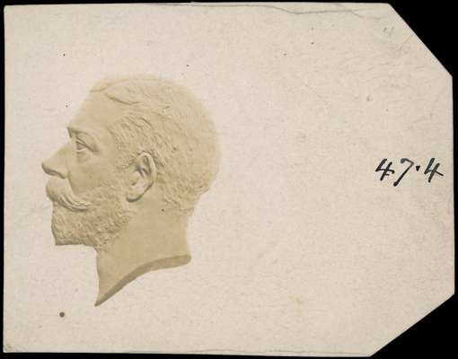 1912 Bas-relief plaque bromide. Very fine example of the Makennal portrait, endorsed at right "47.4", the size of the head in proportion to the frame. Several sizes were trialled for the coinage head portrait that was used for the ½d, 1½d, 2d, 3d, and 4d values. Very scarce.