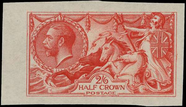 1913 Seahorse colour trial, imperforate in deep red on ungummed ‘JAS WRIGLEY LD-219’ paper, very fine and scarce. SG 399var