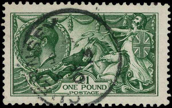 1913 Waterlow £1 deep green fine used with ‘Jersey’ cds, a lovely example, wonderfully deep colour. SG N72(2), £2000.