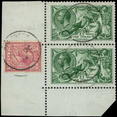 1913 £1 Deep green. Superb used corner marginal pair with an additional 6d Dull purple (SG384) affixed to marginal selvedge, all three stamps neatly cancelled by crisp Guernsey cds's for OC.15.1914. Lovely deep colour, a very unusual and visual piece.