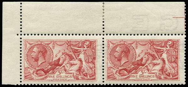 1915 5s Pale carmine (Wmk. Reversed & misplaced). Very fine and fresh unmounted o.g. top left hand corner marginal pair of this rare DLR watermark variety. Ex. Hassan Shaida. Spec. N67(3)c.