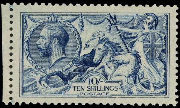 1915 10s Deep blue (Worn plate). Very fine and fresh unmounted o.g. left hand marginal example showing wonderful plate wear, very scarce in this quality. Spec. N70(8). 1985 RPS Cert.