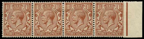 1924 1½d Red brown (Wmk. Block Cypher). Very fine unused o.g. right hand marginal horizontal strip of four showing variety "Imperf between right side and margin". Very scarce. Spec. N35(1)f.