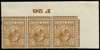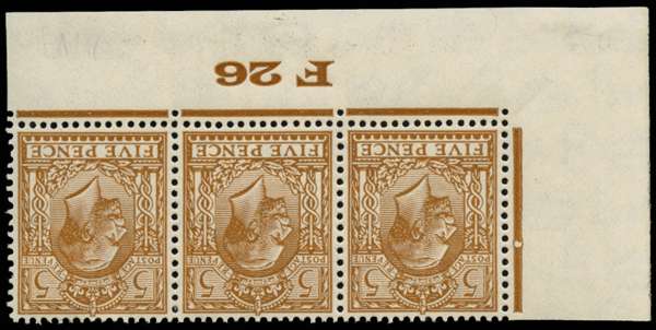 1926 5d Brown (Wmk. Block Cypher, Inverted). Very fine unmounted o.g. F26 perf type 2(E) control strip of three printed by Waterlow from plate 2b. Scarce. Spec N40(1)a.