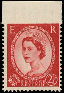 1955 2½d Carmine (Type 1, Wmk. St Edwards Crown Crown). Superb unmounted o.g. example showing variety Imperf between stamp and top margin. Rare only 12 examples recorded. Spec. S52a.