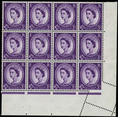GB: 1958 3d deep lilac, l/r corner marginal block of 12 (4x3) the corner stamp showing pre-perforating paper fold