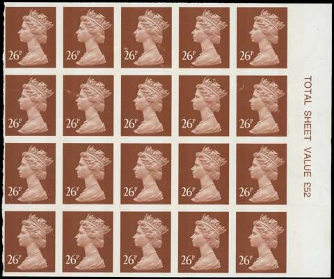 1996 26p red-brown (2 bands) imperforate right hand marginal block of 20 (5x4) with “TOTAL SHEET VALUE £52” in margin: an impressive error, faults including heavy creasing, unmounted o.g. SG Y1691