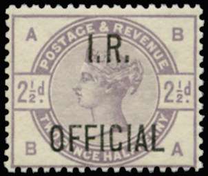 1885 2½d Lilac (I.R. Official). Very fine unmounted o.g. example BA. Lovely colour and gum, very scarce as such. 2005 BPA Certificate of a Block of four from which this single was taken.
