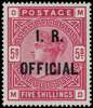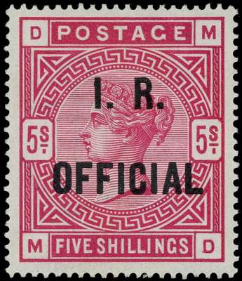 INLAND REVENUE OFFICIAL: 1890 5/- rose (MB) on white paper, opt in blue black, large part o.g. very fine example of this scarce departmental issue. RPSL Certificate (1996) SG O9b £14,000