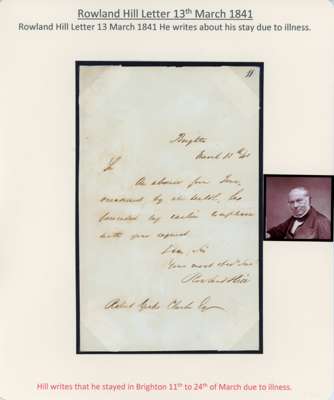 1841 (13th March) signed Rowland Hill letter where he writes that he has had a prolonged stay in Brighton due to ill-health.