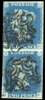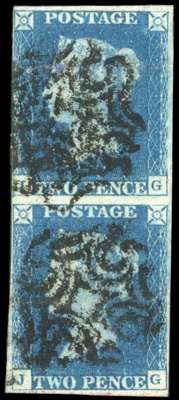1840 2d blue Plate 2 (IG-JG) vertical pair, touching to clear margins, used showing Leeds distinctive MC in black, top and lower stamps with horizontal creases, otherwise fine, still a collectable example with this cancel. SG 5; Spec DS8vh priced £6000+
