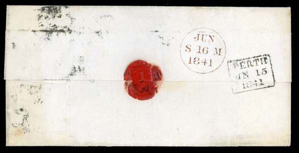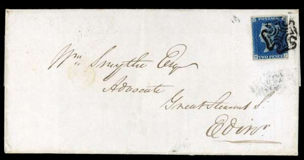 1840 2d blue, Plate 2 (HJ), touching to good margins on entire to Edinburgh and tied by distinctive black Perth Maltese Cross and backstamped by Perth boxed h/s for JN 15 1841. Some light creasing clear of the adhesive, still rare and attractive. SG 5.