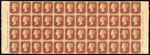 1841 1d red-brown Plate 10 (EA-HL) from black plates, marginal block of forty-eight (!), just clear to enormous margins with marginal inscriptions present at left and right, mint brilliant large part o.g., trivial tones and couple of vertical bends, still an impressive and spectacular item, ideal for exhibition. SG 7 cat £120,000+