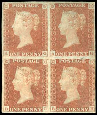 1841 1d red-brown Plate 11 part o.g. block of four, AG-BH. The upper pair is without gum, from State 2, showing the characteristic firm right borders, AH with recut left serif; the lower pair with large part gum, from State 1. Some fairly innocuous gum wrinkles and soiling; a rarity. BPA Certificate (1971), ‘genuine, stained and creased’, which seems harsh. SG 7, Spec. AS 75, cat £34000 as singles